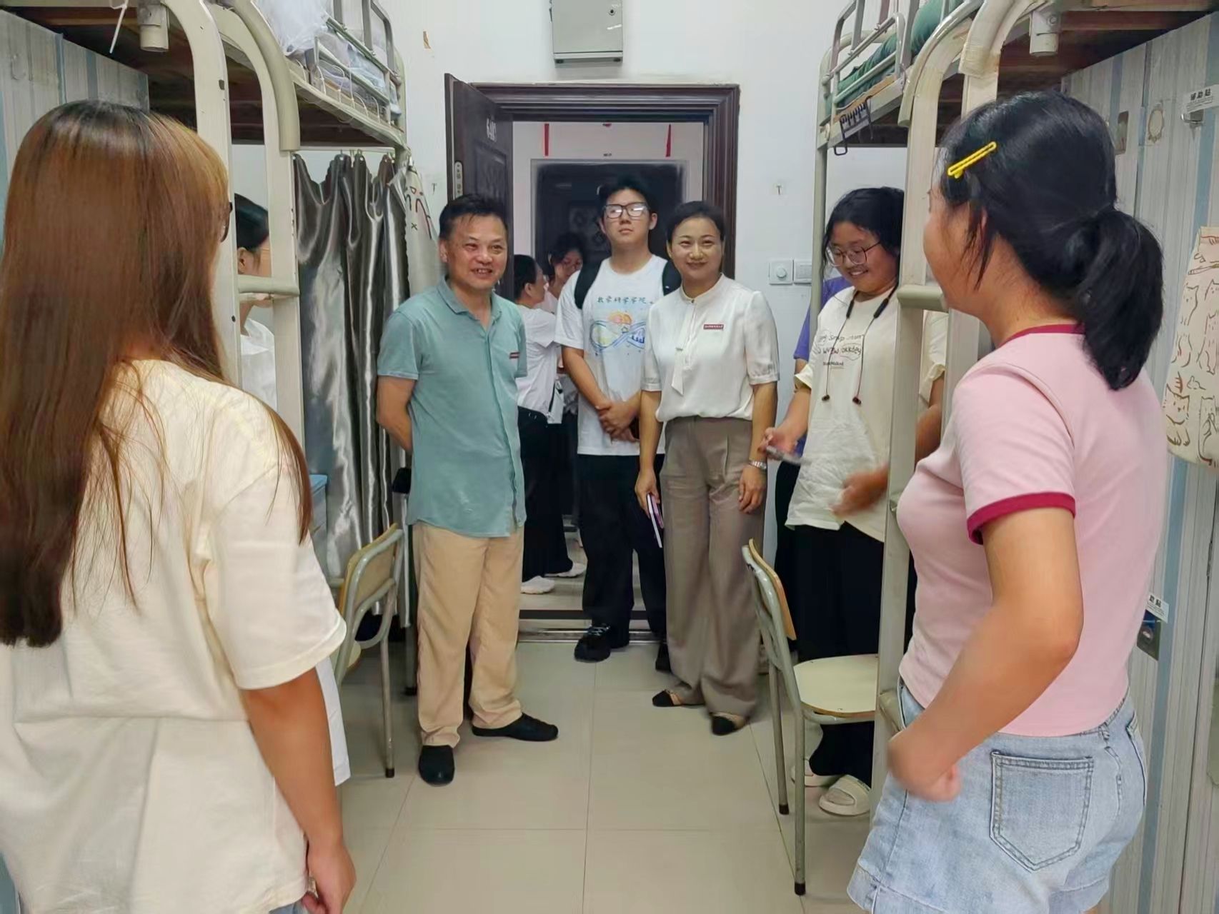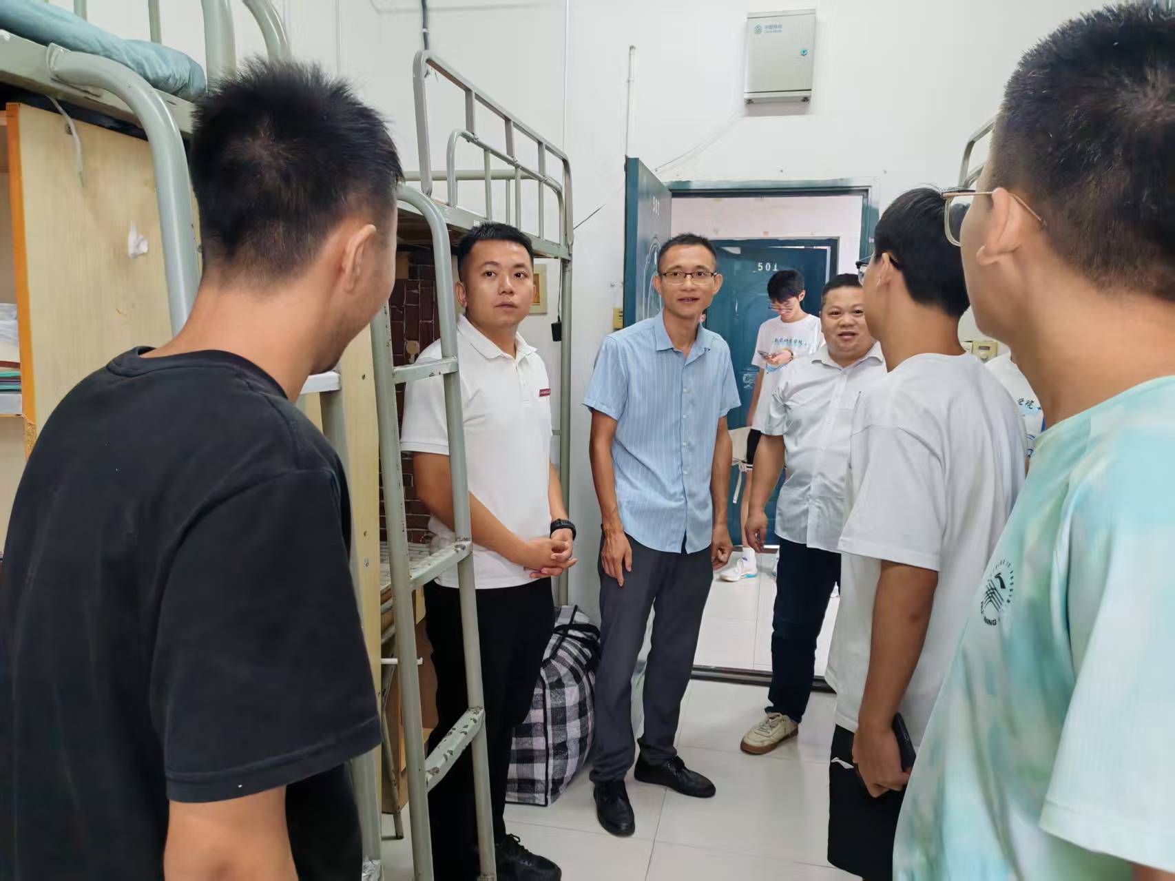 当天晚上,学院党委书记熊鹰、副院长(主持行政工作)刘招带领学院班子成员、新生班主任及辅导员一行,深入新生宿舍走访慰问,为刚踏入校园的2025级同学送去学院的温暖与关怀。